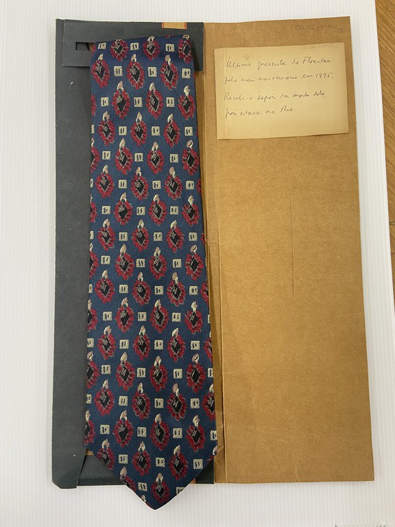 Esta gravata foi comprada por Florestan Fernandes (1920-1995) para presentear seu amigo de longa data, o sociólogo, crítico literário e professor emérito da USP Antonio Candido (1918-2017), por ocasião de seu aniversário, no ano de 1995. Naquele ano, Florestan passava por problemas de saúde e não pôde entregar o presente em mãos a Candido, que acabou recebendo o presente após o falecimento de Florestan.