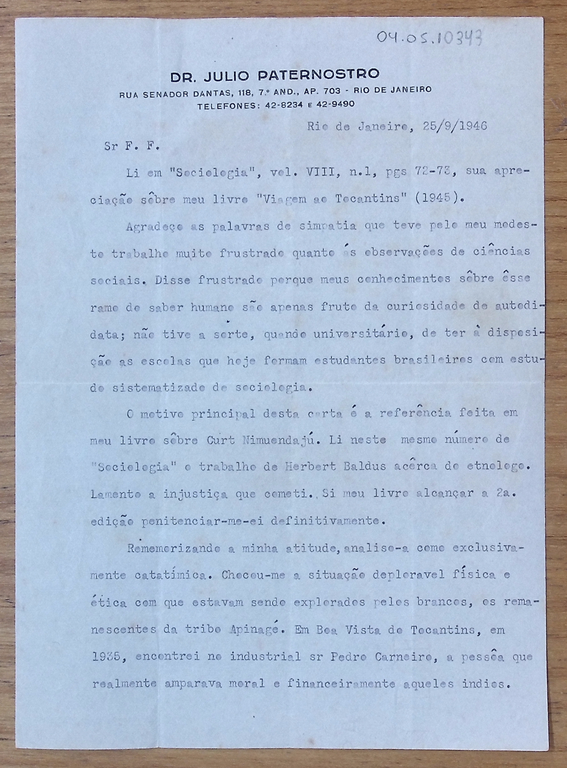 O pesquisador fez descobertas importantes (clique para acessar) e resgatou curiosidades memoráveis em suas investigações, como uma Carta publicada em 25/09/1946, no Rio de Janeiro, do remetente Julio Paternostro¹ endereçada a Florestan Fernandes. No documento, o autor comunica que leu a apreciação de Florestan Fernandes a seu livro “Viagem ao Tocantins” (1945) na revista Sociologia. Agradece a simpatia demonstrada pelo livro e as necessárias correções apontadas por Florestan, em especial quanto à injustiça que foi cometida contra Curt Nimuendajú². Afirma que irá corrigir essa injustiça caso haja uma nova reedição.