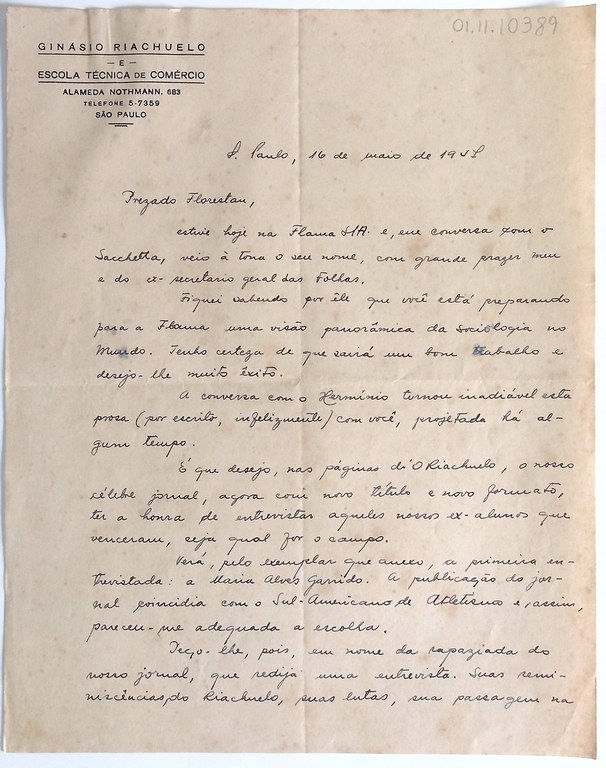 No documento, o prof. Ênio Chiesa¹ relata que encontrou Hermínio Sacchetta², que mencionou o trabalho em que Florestan Fernandes estava escrevendo uma visão panorâmica sobre a sociologia no mundo para a editora Flama. Convida Florestan Fernandes, como ex-aluno do Ginásio Riachuelo, para dar uma palestra de tema de sua livre preferência entre os meses de agosto e novembro para o Grêmio Riachuelo. Ênio Chiesa era professor de latim no Ginásio Riachuelo, onde Florestan Fernandes fez o curso de madureza. Ambos prestaram exames de madureza na mesma época, sendo Ênio Chiesa nessa ocasião professor de Florestan Fernandes. Diz Florestan Fernandes em A Sociologia no Brasil: "Ênio Chiesa, nosso professor de latim, por exemplo, também era candidato aos exames de madureza. Em consequência, tínhamos um professor que era um companheiro". (p. 152, localização na ColEsp: 03.07.01/065).